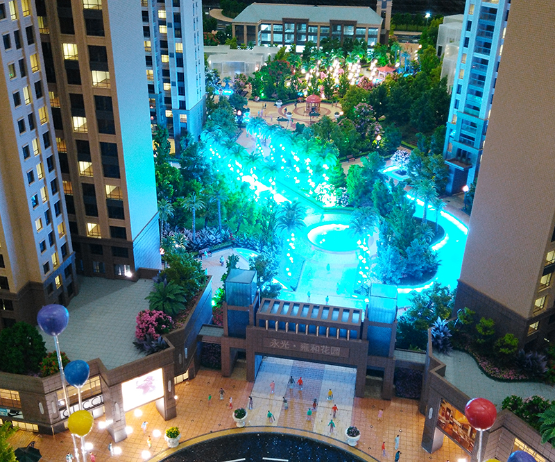 模型采用ABS等材料經(jīng)過CAD畫圖手工拼接、上色等制作工藝完成、并在模型內(nèi)部輔助LED燈光達(dá)到客戶展示要求